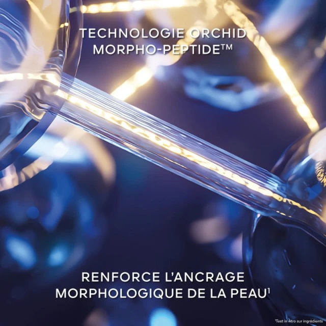 Véritable concentré de récupération, le Masque Orchidée Impériale enveloppe la peau dans un voile de confort revitalisant. Il allie la technologie Orchid Morpho-Peptideᵀᴹ, capable de cibler les points d’ancrage de la peau impliqués dans le maintien de sa morphologie¹, à un peptide apaisant ciblant les rides liées aux micro-contractions². La peau semble ressourcée, lissée, et les traits du visage paraissent détendus.