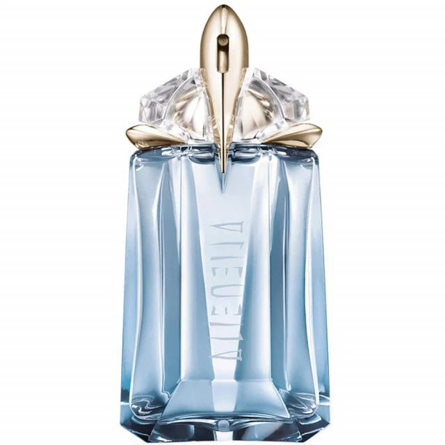 Le flacon talisman Alien Mirage est teinté d’un dégradé bleu-gris aux reflets cristallins. Un soleil signe son étui d’un liseré d’or pour différencier l’édition limitée.