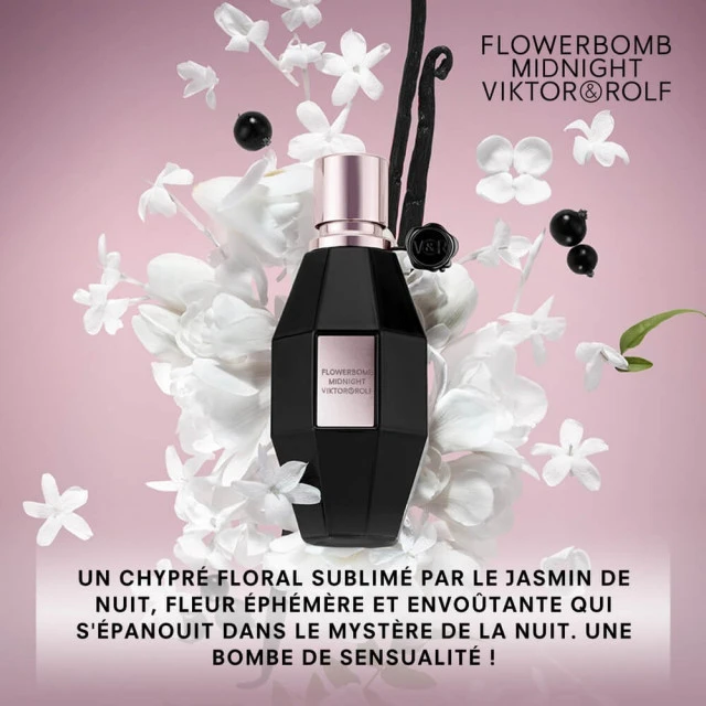 LA PLUS MYSTÉRIEUSE DES ÉCLOSIONS Flowerbomb Midnight est un parfum pour femme floral, une bombe de sensualité construite autour du jasmin de nuit. Aussi appelée « reine de la nuit », cette fleur mystérieuse n’éclot et ne révèle son parfum envoûtant qu’à la tombée du jour. Son Olfaction est un Chypré Floral aux notes de Cassis, De Jasmin de Nuit, de Vanille et de Musc en fond. Un parfum féminin envoutant et captivant.