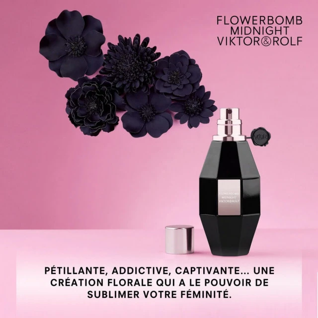 À MINUIT, TOUT DEVIENT POSSIBLE Flowerbomb Midnight est la nouvelle facette mystérieuse de Viktor&Rolf Flowerbomb, : envoûtante et captivante, cette Eau de Parfum pour femme célèbre minuit, un moment de transformation où les femmes se libèrent et laisser leur sensualité exploser.